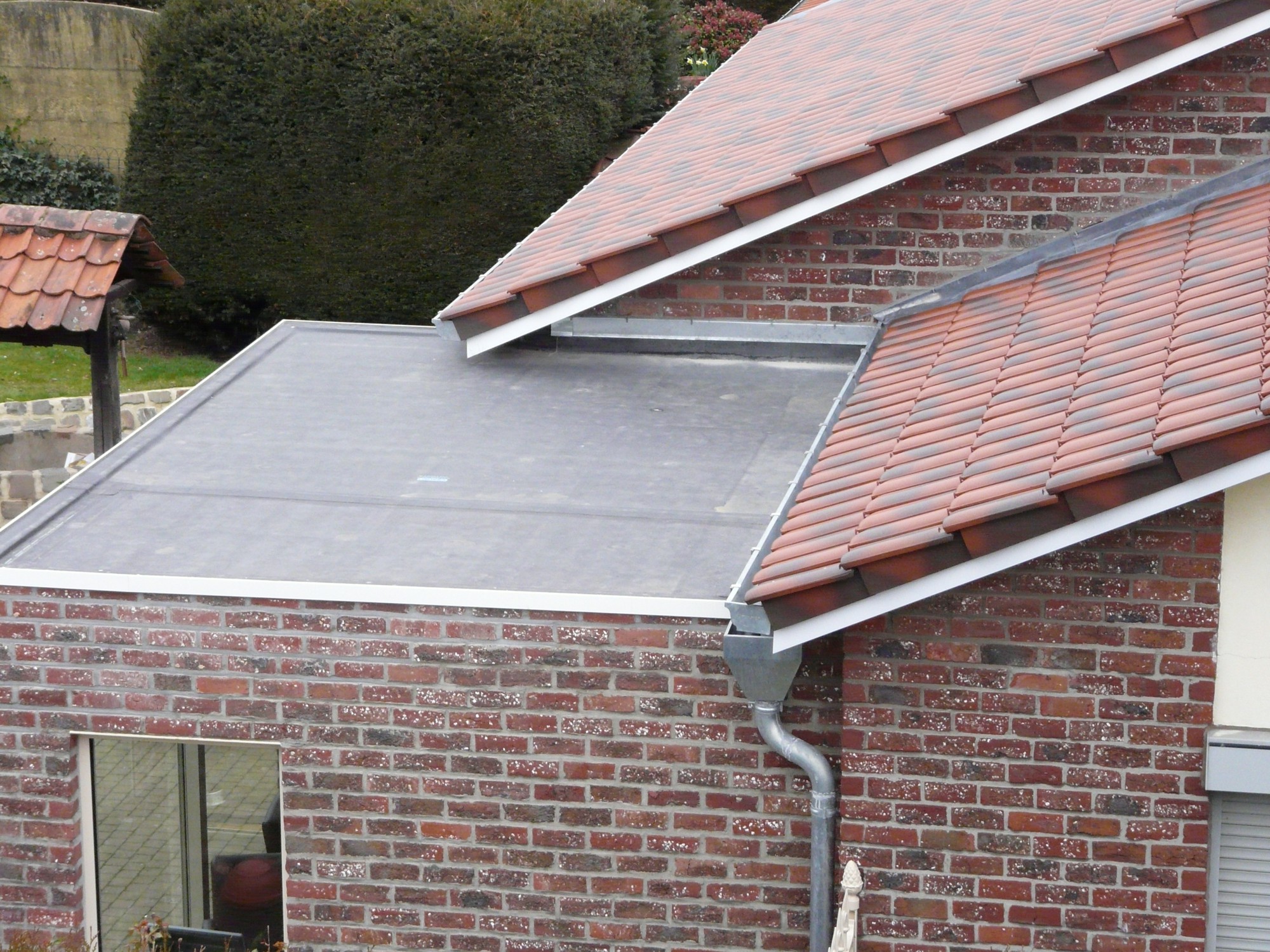 Plat dak uitgevoerd in Mastersystems, 10 cm PUR isolatie, volledig gelijmd op houten draagconstructie. De buitenmuur werd eveneens door ons verhoogd met 3 lagen bakstenen.